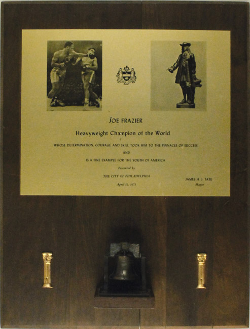 Description:1971 Joe Frazier presentational large format award from The City of Philadelphia (EX/MT) Large wooden plaque (18"x24") having affixed metal plate which bears printed on imagery of Joe Frazier and Muhammad Ali during their historic bout, the Official seal of Philadelphia, and the famed statue of William Penn. Lettered below, "Joe Frazier, Heavyweight Champion of The World, Whose determination, courage, and skill took him to the pinnacle of success and is a fine example for the youth of America, Presented by The City of Philadelphia April 19, 1971, James H.J. Tate, Mayor." Mounted below is a cast figural representation of the Liberty bell. Light scattered wear to both wooden plaque (which has a small split in the wood toward lower edge) and affixed metal plate. Includes letter of provenance from the Frazier family: EX/MT ($500-$1,000)