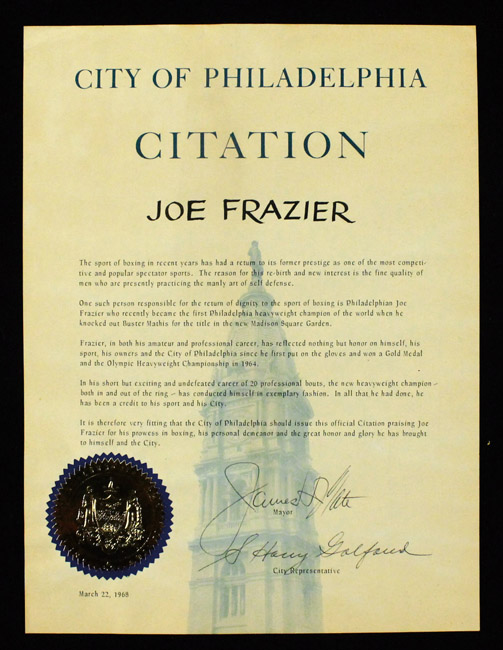 Description:1968 Joe Frazier "City of Philadelphia Citation" (EX-EX/MT) Official "City of Philadelphia Citation" (9"x12") as presented to Joe Frazier dated March 22, 1968 and signed by Mayor James Tate and a City Representative. Frazier name is hand caligraphed at top with text below extolling his success in the ring and his help in the re-birth of interest in boxing and "the great honor and glory he has brought to himself and the City." Mild toning and a touch of very light scattered wear. Includes letter of provenance from the Frazier family: EX-EX/MT ($300-$500)
