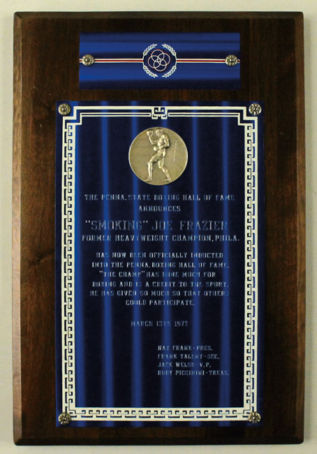 Description:1977 Joe Frazier Pennsylvania State Boxing Hall of Fame Induction plaque (EX/MT) Presentational piece (10"x15") with affixed metal plate having medallion of boxer at top and lettered throughout with text/titling. Reads in part, "The Penna. State Boxing Hall of Fame Announces Smoking Joe Frazier Former Heavyweight Champion, Phila. Has now been officially inducted...March 13th 1977." ($300-$500)