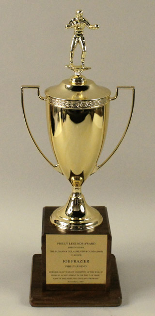 Description:2007 Joe Frazier "Philly Legends Award" (EX/MT-NM) Large presentational trophy stands approx. 21" tall with figural boxer and handled trophy cup atop wooden base. Text on placard at front reads "Philly Legends Award Presented by Susanna Delaurentis Foundation to honor Joe Frazier Philly Legend, Former Heavyweight Champion of The World, Highest Achievement in The Field Of Sport, Icon of Philadelphia Grit And Prowess, November 2, 2007." Touch of light (mostly incidental) wear. Includes letter of provenance from the Frazier family: EX/MT-NM ($300-$500)
