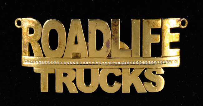 Description:Joe Frazier's "Roadlife Trucks" medallion (marked 18ct) (EX/MT) Gold medallion (marked "18ct" on back) as presented to Joe Frazier during a period of his involvement with the Roadlife Trucks company. Accented by a band of small diamonds between rows of lettering. Weighs (18) grams with light evident usage wear. Includes letter of provenance from the Frazier family: EX/MT ($750-$1,000)
