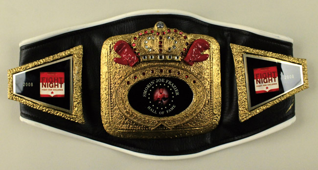 Description:2008 Joe Frazier "Fight Night" Hall of Fame presentational belt (EX/MT-NM) Black leather belt with ornate gold colored cast metal central portion having crown flanked by boxing gloves at top with inset picture and "Smokin Joe Frazier Hall of Fame" titling. On either side are the "2008 Round 19 Fight Night Fight For Children" logo placards. Presented to Frazier when he was the guest of honor at the 2008 Fight For Children Fight Night festivities in Washington D.C. Minimal wear with small streak of errant gold color in one area. Includes letter of provenance from the Frazier family: EX/MT-NM ($300-$500)
