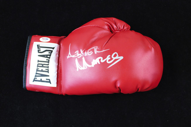 Description:Abner Mares signed boxing glove, PSA/DNA (NM). Everlast boxing glove signed by Mares in silver marker. Signature rates 8/9 out of 10. Comes with COA from PSA/DNA (serial #ed sticker is affixed): NM