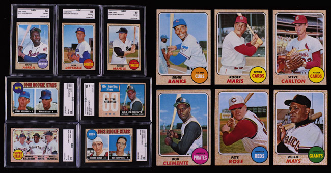 1968 Topps baseball complete set of (598) with a selection of choice NM cards throughout (7 graded incl. SGC 80 EX/NM Ryan Rookie) (Range VG-NM) ($1,500-$2,500) Nice set overall with a small number falling toward lower end of stated range, most cards EX or better, and a number of EX/MT and EX/MT-NM "pack fresh" cards. Keys: 45 Seaver (miscut, otherwise EX/MT-NM), 50 Mays (VG), 80 Carew (EX/MT), 86 Stargell (EX/MT), 100 Gibson (EX/MT-NM OC), 110 Aaron (SGC 80 EX/NM), 145 (NM), 145 Drysdale (SGC 88 NM/MT), 150 Clemente (VG miscut), 177 Ryan (SGC 80 EX/NM), 220 Killebrew (VG), 230 Rose (EX-EX/MT OC), 247 Bench (SGC 80 EX/NM), 250 Yastrzemski (EX), 280 Mantle (SGC 80 EX/NM), 330 Maris (EX/MT-NM), 355 Banks (EX/MT-NM), 370 Aaron (VG), 374 Clemente (SGC 84 NM), 408 Carlton (NM), 480 Manager's Dream (NM), 490 Superstars (SGC 80 EX/NM), 500 Robinson (miscut), 520 Brock (EX OC), 528 Tigers (EX/MT), 575 Palmer (miscut, otherwise EX/MT-NM): Range VG-NM