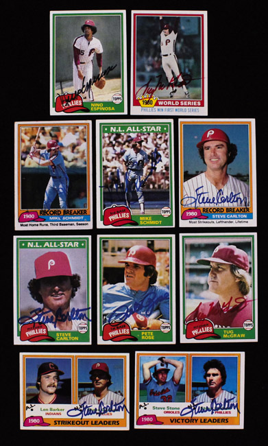 Description:Lot of (38) Philadelphia Phillies signed 1981 Topps Baseball cards (VG/EX-NM). Incl. (2) different Mike Schmidt, (4) different Steve Carlton, Pete Rose, (2) different Tug McGraw, Nino Espinosa, Dallas Green, (2) different Larry Bowa, Garry Maddox, (2) different Greg Luzinski, (2) Bob Boone (one Topps and one Coca-Cola), Manny Trillo, Bob Walk, Lonnie Smith, Dick Ruthven, Dickie Noles, Warren Brusstar, Greg Gross, Sparky Lyle, Larry Christenson, Del Unser, Randy Lerch, George Vukovich, Gary Matthews, Ron Reed, Keith Moreland, Dick Davis, Ramon Aviles, Kevin Saucier, Mike Proly, and multi-signed Marty Bystrom / Jay Loviglio / Jim Wright. Signatures rate 5/6 to 10 (avg 8) out of 10. Most cards appear to average EX/MT overall. Range: VG/EX-NM