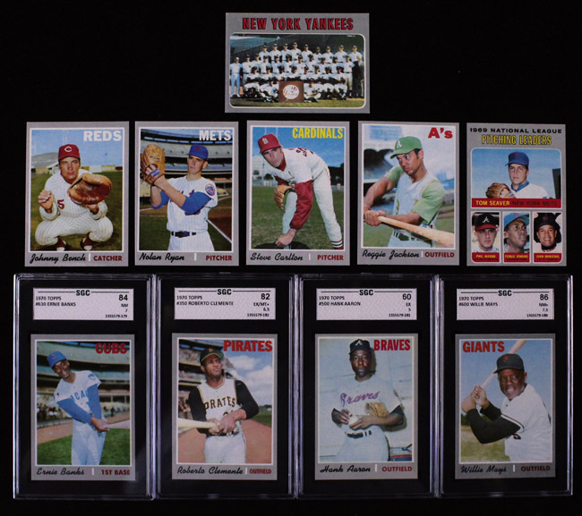 Very sharp 1970 Topps baseball complete set of (713) cards - mostly "pack fresh" EX/MT or better and very few EX or lower (Range VG-NM/MT) ($1,500-$2,000) Keys/graded: #10 Yastrzemski (EX/MT-NM), 140 Jackson (NM), 150 Killebrew (NM), 189 Munson (EX/MT OC), 197 Ryan (EX OC), 211 Williams (EX/MT-NM), 220 Carlton (NM), 230 Robinson (EX/MT OC), 290 Carew (NM miscut), 300 Seaver (NM OC with some print defect), 330 Brock (EX/MT), 350 Clemente (SGC 82 EX/MT+), 458 Rose (EX/MT with some print lines), 459 Jackson (EX), 461 Yastrzemski (VG/EX), 462 Aaron (EX/MT-NM OC), 500 Aaron (SGC 60 EX), 530 Gibson (EX/MT OC), 580 Rose (trimmed), 600 Mays (SGC 86 NM+), 630 Banks (SGC 84 NM), 640 Kaline (EX/MT-NM slightly OC with a spot at top edge), 660 Bench (NM), 670 Santo (EX/MT-NM), 700 Robinson (EX/MT-NM), 712 Ryan (EX/MT-NM with extremely slight diamond cut), 7