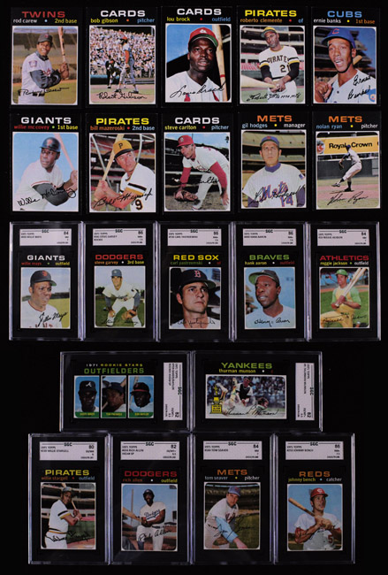 1971 Topps baseball complete set of (752) cards in outstanding overall condition (most in "pack fresh" EX/MT or better condition with many better) (incl. 11 graded with 7 SGC 84 NM or better) (Range EX-NM/MT) ($1,500-$2,000) Keys: #1 Champions (EX/MT-NM), 5 Munson (SGC 82 EX/MT+), 14 Concepcion (EX/MT OC), 20 Jackson (SGC 84 NM), 26 Blyleven (EX-EX/MT), 50 McCovey (NM), 55 Carlton (NM), 100 Rose (EX-EX/MT OC), 160 Seaver (SGC 84 NM), 180 Kaline (EX/MT), 210 Carew (NM slightly OC), 230 Stargell (SGC 80 EX/NM), 250 Bench (SGC 86 NM+), 300 Robinson (EX/MT-NM slightly OC), 341 Garvey (SGC 86 NM+), 350 Williams (NM), 380 Williams (color possibly added at one edge), 400 Aaron (SGC 86 NM+), 513 Ryan (EX/MT-NM OC), 525 Banks (EX/MT OC), 530 Yaz (SGC 86 NM+), 550 Killebrew (EX/MT), 570 Palmer (NM), 600 Mays (SGC 84 NM), 625 Brock (NM OC), 630 Clemente (NM), 640 Robinson (EX/MT-NM), 650 Allen (SGC 82 EX/MT+), 709 Baker (SGC 82 EX/MT+): Range EX-NM/MT