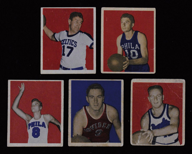 Lot of (21) 1948 Bowman Basketball cards including Joe Fulks rookie (GD-EX). Incl. #s 1 Calverley (VG), 2, 5, 6, 11, 12, 13, 15, 18, 23, 24, 25, 26, 27, 28, 29, 30, 31, 32 Red Holzman (GD), 34 Joe Fulks (GD-G/VG), and 36. Most appear to average VG-VG/EX overall. Range: GD-EX