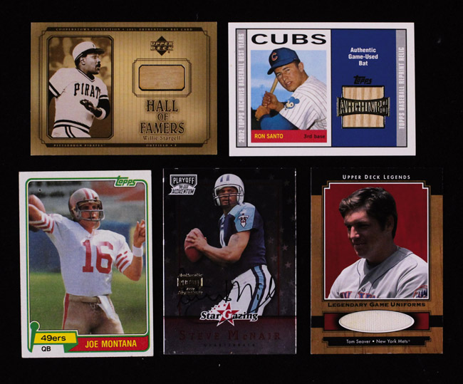 Description:Lot of (49) baseball and football cards including Montana rookie plus signed and game used insert cards (EX-NM). Incl. 1981 Topps #216 Joe Montana rookie (EX/MT); (6) signed football insert cards from 1997-2006 including Steve McNair, Isaac Bruce, Taylor Stubblefield, Todd Watkins, Charlie Whitehurst, and Marlin Jackson; (18) football game used swatch insert cards including Donovan McNabb, Larry Fitzgerald, Peyton Manning, Edgerrin James, Steve McNair (#ed 31/250), Marshawn Lynch (#ed 240/249), Brian Urlacher, Alge Crumpler (#ed 82/250), DeAngelo Hall (467/500), Richard Seymour, and others; (5) signed baseball insert cards including Jim Kaat, Joe Niekro, Rico Carty, Anibal Sanchez, and Joel Hanrahan; (19) baseball game used swatch insert cards including Willie Stargell, Ron Santo, Tom Seaver, Tony Gwynn, Barry Bonds, Pedro Martinez, Randy Johnson, Edgar Martinez, Vladimir Guerrero, Juan Gonzalez, Sammy Sosa, Carlos Delgado, Carlos Gonzalez, Johan Santana, Jason Giambi, Eric Gagne, and others: EX-NM