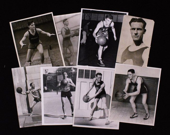 Description:Lot of (75) vintage sports photographs, mainly basketball, c.1922-1981 (GD-NM). Includes (40) basketball photos, with remainder being various track and field images (including a nice original action shot of Jesse Owens at the A.A.U. Indoor Championships smashing the 60 meter sprint record). Most appear to be from the 1930s-50s. Subjects include Charlie Trippi (as a basketball player at Georgia), Cazzie Russell, Jesse Mortensen, Wally Cameron, Carl Shy, James Bausch, Mike O'Neill, Hank Moroski, Jack Molinas, Sterling Forbes, Jack Nichols, Henry Poppe, Bud Olsen, Bud Houser, Edwin Wide, Harry Chauca, Jimmy Carlton, Adrian Talley, Roy Cochran, Carl Merritt, Walt Davies, and others. Various conditions throughout the lot. Most appear to grade VG/EX overall with typical handling wear, and normal stampings/writing on backs. Range: GD-NM
