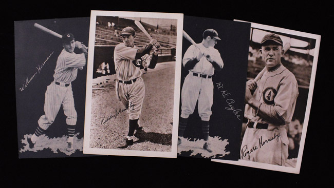 Description:1931 and 1932 Chicago Cubs near complete picture pack sets (see description). Incl. 1931 Cubs picture pack near set (30/36) with Kiki Cuyler, Gabby Hartnett, Rogers Hornsby, Ray Schalk, Hack Wilson, and Willian Wrigley (only missing Beck, Grace, Lewis, Srys, and P.K. Wrigley), most appear to average EX-EX/MT overall (GD-NM); and 1932 Cubs picture pack near set (34/35 only missing Campbell) includes Kiki Cuyler, Burleigh Grimes, Gabby Hartnett, Billy Herman, and both Wrigleys (most have small pinholes, but minimal wear otherwise, and display as EX/MT-NM overall). Range: FR/GD-NM with note to pinholes for 1932