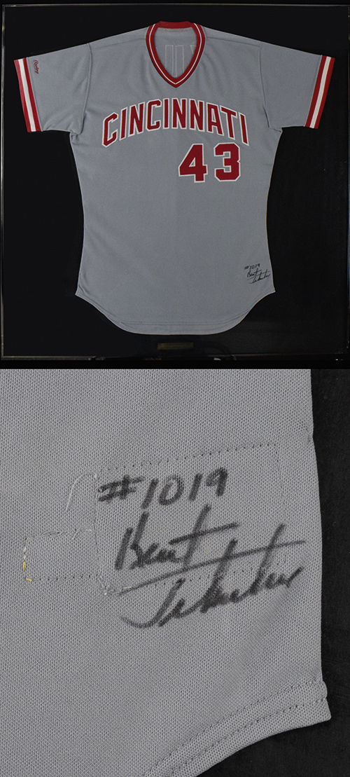 Description:1989 Kent Tekulve autographed Cincinnati Reds professional model road jersey as worn in Major League record setting game on 4/17/89 (EX) Road gray jersey with "Cincinnati" team name lettered across the front with player number "43" below. Number, presumably, also appears on the back below the name "Tekulve." Outline of the stitching for a Rawlings manufacturers tag, and year/set number flag tag, can be seen at lower front tail however the jersey has been framed for display and they can not be visually inspected. Measures 39"x40.5" overall with engraved metal placard at bottom noting the game date and significance. Teke established on new Major League record for Relief Appearances taking the mound in this game. Signed in black marker, "#1019 Kent Tekulve" rating 8 out of 10. Includes 14"x22" framed Cincinnati Enquirer printed souvenir page from the day an article ran which covers Teke's noted performance and letter of provenance from Kent Tekulve: EX ($300-$500)