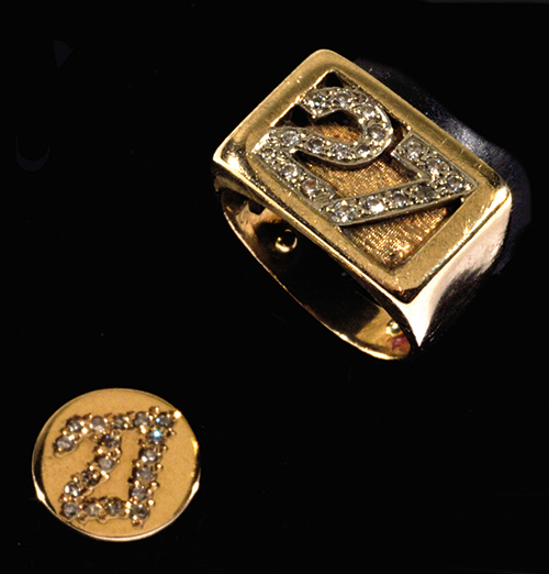 Description:Kent Tekulve's gold and diamond number "27" ring and tie-tack (EX-EX/MT and EX/MT) Includes ring which is done in gold (unmarked) and has the number "27" on top face done in (18) small diamonds" (weighs 5 grams); circular tie-tack likewise done in gold with "27" done in (18) small diamonds (under 1 gram). Mild wear to ring with tie-tack effected to lesser degree. Includes letter of provenance from Kent Tekulve: EX-EX/MT and EX/MT ($300-$500)