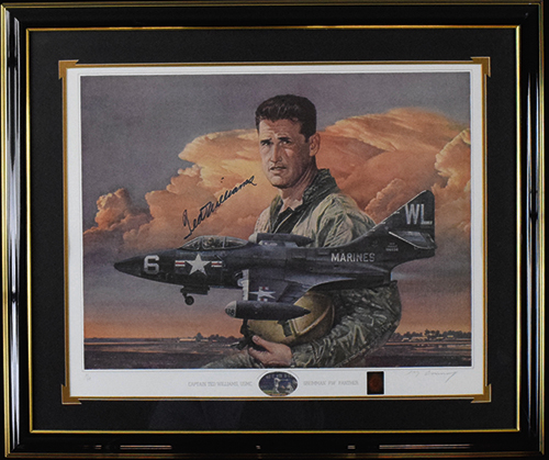 Description:Ted Williams signed limited edition lithograph also signed by artist Merv Corning (Green Diamond) (NM) Framed Ted Williams lithograph captioned "Captain Ted Williams, USMC" "Grumman F9F Panther". Williams signed the lithograph in blue marker. Signature rates 9/10 out of 10. Also signed by artist Merv Corning, and #ed out of 99. Comes with Ted Williams "Green Diamond" COA (hologram sticker is affixed). Measures 27"x32" overall: NM