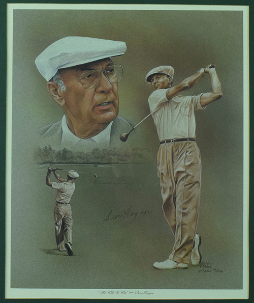 Description:Ben Hogan signed lithograph also signed by artist Ken Modak (NM). 20.5"x23.5" framed "The Will To Win" lithograph signed by Hogan in brown marker. Signature rates 8 out of 10. Also signed by artist Ken Modak. Due to framing, complete condition is unknown: NM appearance