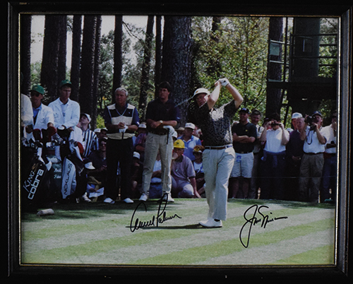 Description:Jack Nicklaus and Arnold Palmer dual-signed framed photograph (NM). 12"x14.5" framed photo signed by both Nicklaus and Palmer in black marker. Signatures 9 to 9/10 out of 10. Due to framing, complete condition is unknown: NM appearance