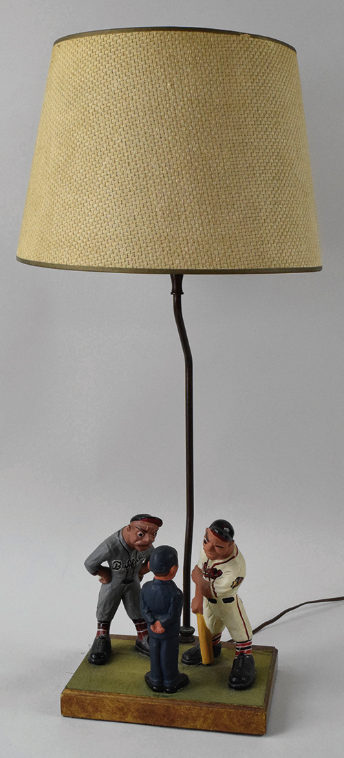 Description:1941 Rittgers baseball figures (set of 3) displayed on vintage lamp base (Figures EX/MT, Lamp overall EX) Trio of vintage baseball Rittgers figures with the batter in "Buffalo" uniform and pitcher in "Chiefs." Impressed marking with 1941 date can be seen on foot of batter and all appear to be in very strong, nearly as issued, condition. Mounted to the wooden base of a lamp which appears vintage to the era and has green felt simulating grass on top surface. While it can not be stated with certainty our consignor has relayed that this was a very limited release production piece done by Rittgers. Stands 31" tall with some natural aging throughout and mild wear to the shade: Figures EX/MT, Lamp overall EX ($500-$750)