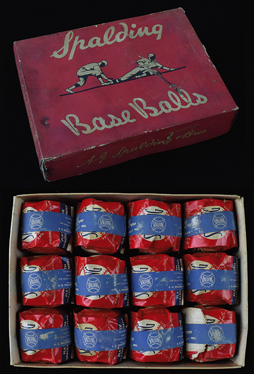 Description:Spalding c.1950s Piedmont League Official baseballs (12) in original box (Box VG, Balls avg. EX/MT) One dozen Spalding Official Piedmont League baseballs, each remaining sealed in the original paper bag wrapper with band. President noted on packaging appears to have the last name Summers. Paper bag wrappers have light wear which is largely limited to some scuffs on bands and light toning. The store display box has scattered wear with scuffs and chips and some discoloration and color fading: Box VG, Balls avg. EX/MT ($1,500-$2,000)