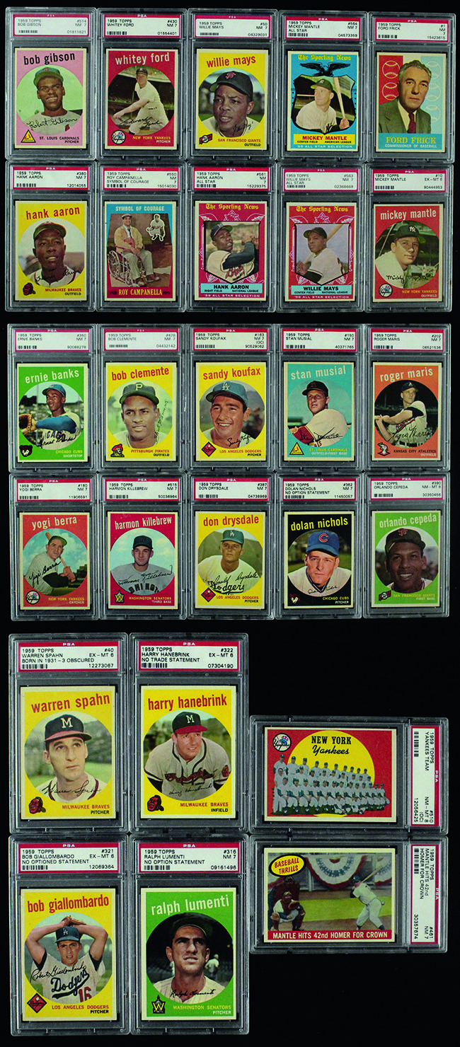 Description:High grade 1959 Topps baseball near complete master set of (579) cards (includes full base set of 572 in mostly PSA 7 or better) (Range PSA EX/MT 6 to NM MT 8) Consistently strong high grade set assembled by a dedicated collector currently ranks as the 19th finest ever assembled on PSA's registry and falls only (2) cards short of being a complete master set. A complete listing of cards and grades can be seen on the PSA website in the set registry section under "Marfak's 1959 Topps." We strongly encourage interested bidders to review the listing there or contact our offices to have a list sent via fax or email. We list a good number of key cards below however the listing on PSA's website allows for a full review of variations, grades, populations (at grade level and higher), and any qualifiers (46 cards noted as such). Total of (579) cards with (8) PSA EX-MT 6, (523) PSA NM 7, (47) PSA NM-MT 8, and (1) PSA MINT 9 (#533 O/C). Mickey Mantle #10 grades PSA EX-MT (6). Includes the following key cards in PSA 7: #1 Frick, 20 Snider, 30 Fox, 40 Spahn (3 total variations included with 2 others graded 6), 50 Mays, 149 Bunning, 150 Musial, 163 Koufax (O/C), 180 Berra, 200 Giles, 202 Maris, 212 Fence Busters, 295 Martin, 300 Ashburn, 310 Aparicio, 338 Anderson, 350 Banks, 360 Kaline, 380 Aaron, 387 Drysdale, 415 Mazeroksi, 430 Ford, 439 Robinson, 450 Mathews (O/C), 461 Mantle 42nd HR, 464 Mays Catch, 467 Aaron HR, 478 Clemente, 514 Gibson, 515 Killebrew, 550 Campanella, 561 Aaron A/S, 563 Mays A/S, and 564 Mantle A/S. Keys in PSA NM-MT 8: #390 Cepeda, 457 Dodgers team (O/C), and 510 Yankees team (O/C). Exceptionally strong condition throughout: Range PSA EX/MT 6 to NM MT 8 ($7,500-$12,500)