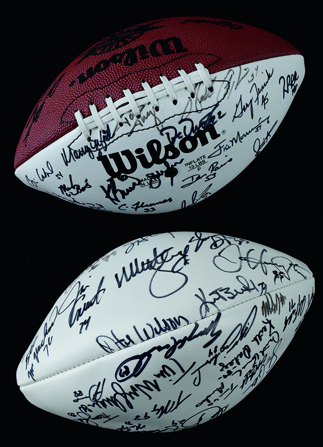 Description:1985 Chicago Bears team signed Super Bowl XX logo football - (41) signatures incl. Walter Payton (EX/MT-NM, see description) Wilson P.Rozelle Official Super Bowl XX logo white panel football has been signed throughout by (41) members of the Champion Chicago Bears. Notables incl. Walter Payton, Richard Dent, Jim McMahon, Mike Singletary, Dan Hampton, and others. Black marker signatures rate 6/7 to 9 out of 10 (Payton approx. 6/7) and the ball is "like new" with no mentionable wear. Our consignor has relayed that it was obtained from the Walter Payton Foundation many years however the paperwork is not included. Please note: as is the case with several other 1985 Bears team balls with this same history the ball was assembled after the individual panels were signed. This has resulted in a few autographs (incl. Payton) being slightly effected by the process (small portions not visible). One of the most desirable modern era team signed pieces with few coming available for sale: EX/MT-NM ($750-$1,250)