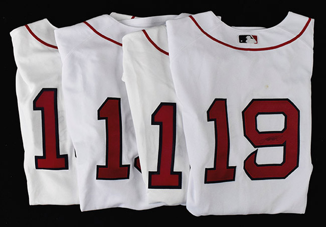 Description:Lot of (4) Josh Beckett autographed Boston Red Sox jerseys (MLB Auth) (EX/MT and EX/MT-NM) Top of the line Red Sox jerseys by Majestic, each signed on the back number in marker rating 8/9 out of 10. Three of the four have MLB Authentication holograms affixed. There is some extremely minor blemishes to (1) jersey and another has some which are somewhat more accentuated: EX/MT and EX/MT-NM