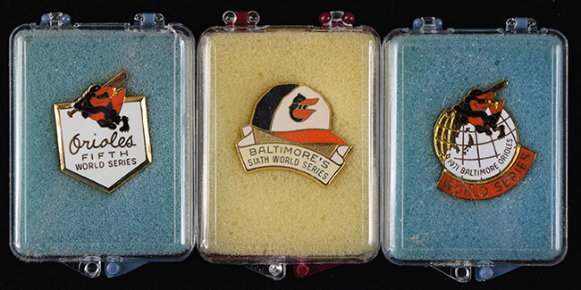 Baltimore Orioles 1971, 1979, and 1983 World Series press pins (NM-NM/MT). Incl. 1971 Orioles press pin (NM/MT), 1979 Orioles press pin (NM), and 1983 Orioles press pin (NM).