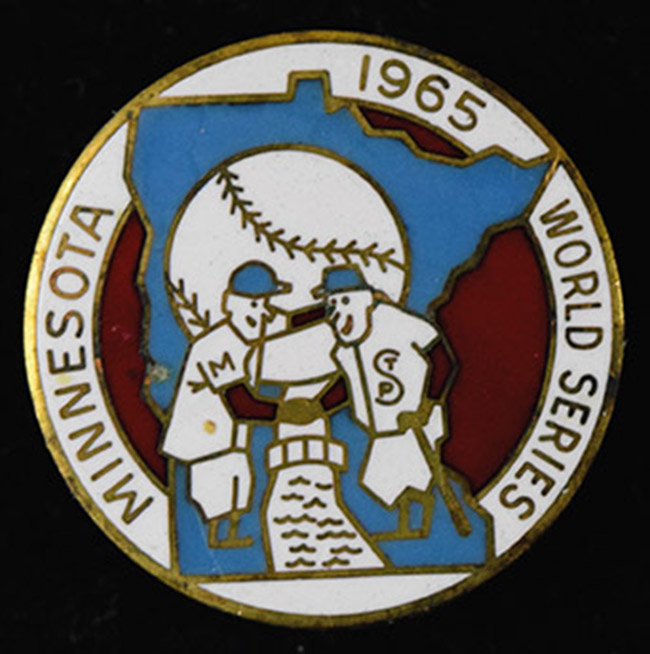 Minnesota Twins 1965 World Series press pin (EX/MT). Front displays as NM/MT, but back has areas of corrosion: EX/MT