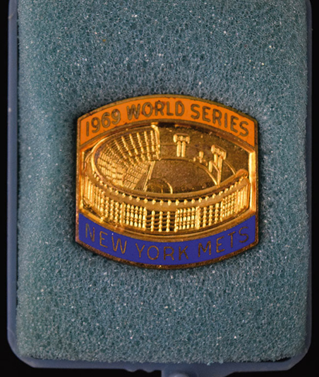 New York Mets 1969 World Series press pin (EX/MT-NM). Minor corrosion visible around the edges: EX/MT-NM