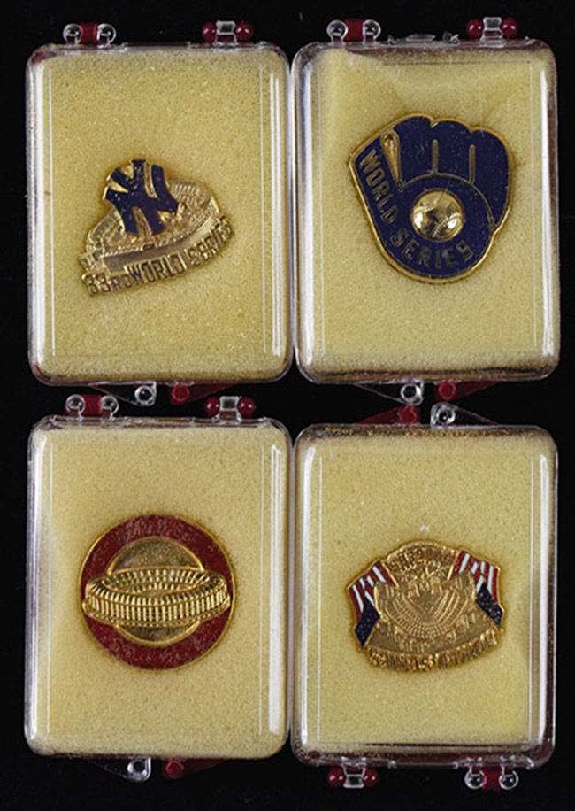 Description:Lot of (5) 1981-1982 World Series press pins/charm (EX/MT-NM/MT). Incl. 1981 Los Angeles Dodgers press pin (NM/MT), 1981 New York Yankees press pin (NM minor foam residue on back), 1982 Cardinals press pin (EX/MT-NM minor corrosion on back/edges), 1982 Milwaukee Brewers press pin (NM), and 1982 Brewers press charm (NM). Range: EX/MT-NM/MT