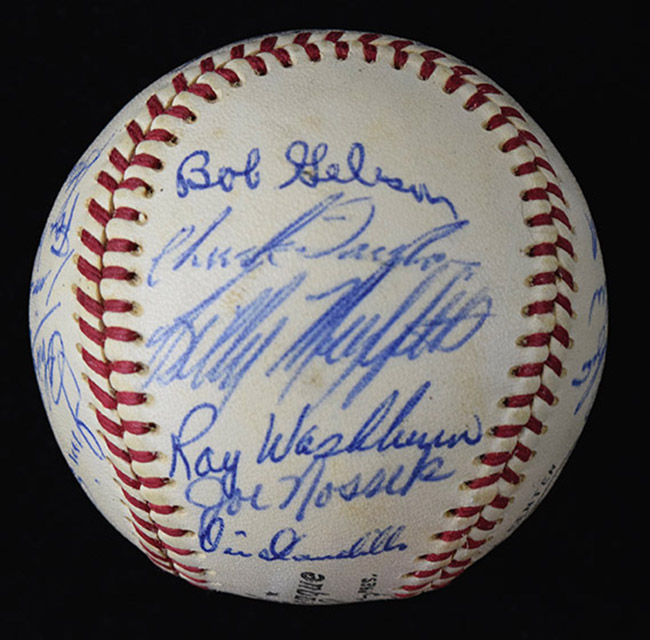 Description:1969 St. Louis Cardinals team signed baseball (NM). W.Giles NL ball signed by (22) members of the 1969 Cardinals including Red Schoendienst, George Kissell, Billy Muffett, Dick Sisler, Bob Gibson, Steve Carlton, Joe Torre, Tim McCarver, Mike Shannon, Ray Washburn, Steve Huntz, Mike Torrez, Dave Giusti, Joe Hoerner, Chuck Taylor, and others. Signatures rate 6/7 to 9/10 (avg 8) out of 10. Just a few small areas of very minor surface wear: NM