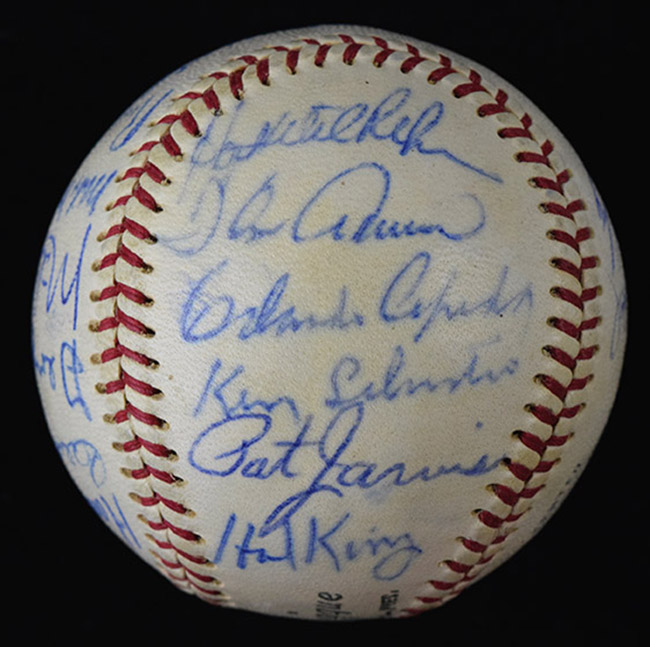 Description:1970 Atlanta Braves team signed baseball (EX/MT-NM). W.Giles NL ball signed by (18) members of the 1970 Braves including Luman Harris, Ken Silvestri, Hoyt Wilhelm, Phil Niekro, Orlando Cepeda, Clete Boyer, Rico Carty, Pat Jarvis, Gilly Garrido, George Stone, Tom Aaron, Ron Reed, and others (Hank Aaron clubhouse signed). Signatures rate 6 to 9 (avg 7) out of 10: EX/MT-NM
