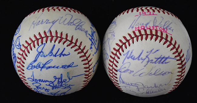 Description:1971 and 1972 Houston Astros team signed baseball (EX/MT-NM). Incl. C.Feeney NL ball signed by (20) members of the 1971 Astros: Harry Walker, Salty Parker, Jim Wynn, John Edwards, Denis Menke, Bob Watson, Don Wilson, Jesus Alou, Ken Forsch, Fred Gladding, and others; and C.Feeney NL ball signed by (22) members of the 1972 Astros: Hub Kittle, Jim Wynn, John Edwards, Roger Metzger, Doug Rader, Bob Watson, Cesar Cedeno, Don Wilson, Larry Dierker, Dave Roberts, George Culver, and others (Walker clubhouse signed). Signatures rate 6 to 9/10 (avg 7/8) out of 10. Both have a few small spots of minor toning: EX/MT-NM