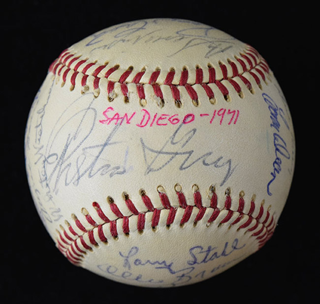 Description:1971 San Diego Padres team signed baseball (NM/MT). C.Feeney NL ball signed by (23) members of the 1971 Padres including Preston Gomez, Whitey Wietelmann, Cito Gaston, Dave Roberts, Don Mason, Ed Spiezio, Ollie Brown, Bob Barton, Dave Campbell, Tom Phoebus, Al Severinsen, and others. Signatures rate 7/8 to 9/10 out of 10: NM/MT