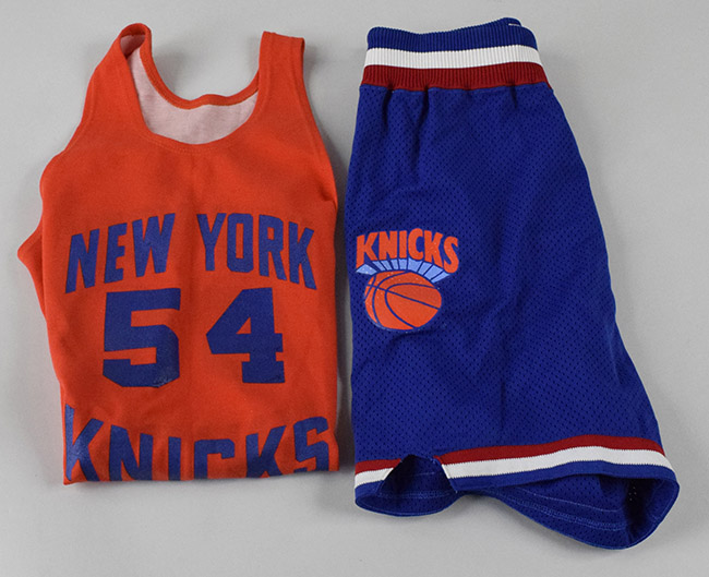 Description:New York Knicks professional model practice jersey and shorts (EX-EX/MT). Includes c. late 1970s - early 1980s Gerry Cosby / Russell Athletic size XXL Knicks #54 reversible practice jersey; and c.1990s Champion size 36 Knicks shorts with NBA Players Association logo screened on one leg and Knicks logo screened on the other leg (extra inseam and extra rise tags within interior): EX-EX/MT
