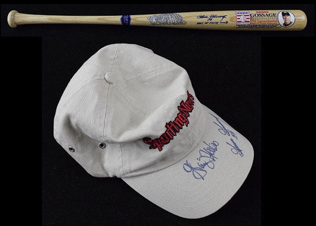 Description:Goose Gossage signed & inscribed baseball bat, plus Gossage & Graig Nettles dual-signed hat (EX/MT-NM). Incl. 34" Cooperstown Bat Co. Goose Gossage commemorative bat signed by Gossage with "Hall Of Fame 2008" inscription; and Sporting News hat signed by both Goose Gossage and Graig Nettles (EX/MT, light wear). Signatures rate 8 to 9/10 out of 10. Both come with COA from JSA (serial #ed sticker is affixed to each): EX/MT-NM