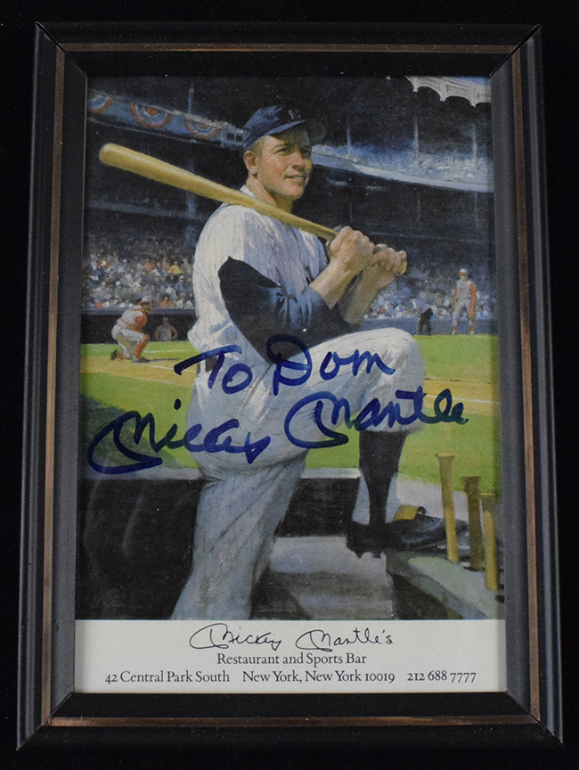 Description:Mickey Mantle signed 5"x7" framed photograph (NM). Mickey Mantle's restaurant photo signed by Mantle in blue marker (personalized to Dom). Signature rates 8 out of 10. Due to framing, complete condition is unknown: NM appearance