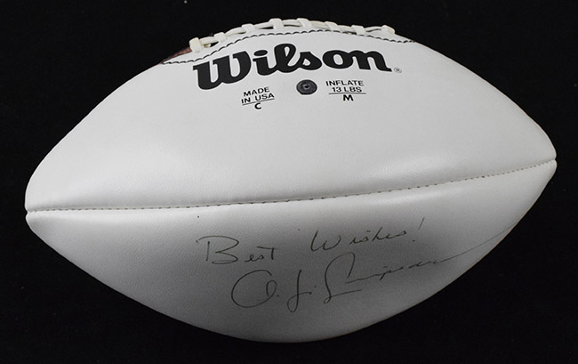 Description:O.J. Simpson signed P.Tagliabue NFL white panel football (EX-EX/MT). Simpson signed the white panel and added "Best Wishes!" inscription. Signature rates 7 out of 10 (minor smudge). Displays little to no surface wear, but does not fully inflate: EX-EX/MT