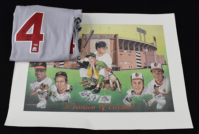 Description:Lot of assorted sports memorabilia, autographs, and posters (EX/MT-NM overall). Autographs include 18"x24" lithograph signed by Art Monk and by artist Garrett Giles (minor crease, #ed 1011/1178); 16"x20" lithograph multi-signed by Roger Craig, Johnny Podres, and Clem Labine (#ed 805/1000, also signed by artist Murray Tinkelman); Russell Athletic size 44 Chicago Cubs #34 Kerry Wood jersey signed by Wood in black marker with "98 ROY" "20 K" inscriptions (Steiner and MLB Authenticated); 21"x27" Terry Labonte lithograph signed by artist Sam Bass (#ed 500/514); and (3) Cal Ripken Jr posters: EX/MT-NM overall