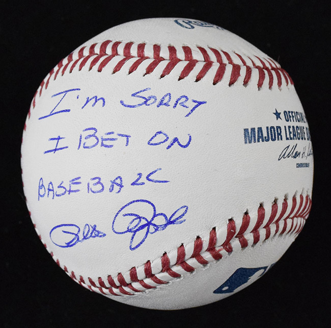 Description:Pete Rose signed baseball inscribed "I'm Sorry I Bet On Baseball", JSA (NM/MT). B.Selig ML ball signed by Rose in blue ink with "I'm Sorry I Bet On Baseball" inscription. Signature rates 9 out of 10. Comes with COA from JSA (serial #ed sticker is affixed): NM/MT