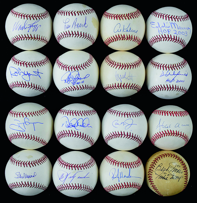 Description:Set of (18) 3,000 Hit Club member single signed baseballs incl. Jeter, Aaron, Mays, Musial, and Ripken (nearly all PSA or JSA authenticated) (Mostly EX/MT or better) Includes Rawlings B.Selig OML baseballs signed by Derek Jeter (laser engraved " First Yankee With 3,000 Hits+Limited Edition+10/22"), Stan Musial (light toning spots), Cal Ripken Jr, Robin Yount, Dave Winfield (HOF inscribed, scattered toning spots), Wade Boggs, Rafael Palmiero (3020 H inscribed), Lou Brock (mild toning spots), Carl Yastrzemski, Tony Gwynn, and Eddie Murray (HOF inscribed); Rawlings B.Brown Official American League balls signed by Rickey Henderson and Al Kaline (light toning); G.Budig OAL ball signed by George Brett (light toning); Coleman ONL ball signed by Hank Aaron (very light toning); Worth Official League Carew signature model ball signed by Rod Carew (inscribed 3053); 1980 All-Star Game logo Official baseball signed by Paul Molitor (mild toning); and Willie Mays signed MacGregor Little League ball (toned). Ink and marker signatures generally rate 8 to 9 out of 10 with Brett a touch lesser. Ball with more prominent spotting/toning are mentioned, some others may be effected to lesser degrees. A small number have a very small indentation to leather which is presumably the result of being housed in a prior display. All except Molitor, Carew, and Henderson have either PSA or JSA authentication sticker affixed (certificate cards are not included): Mostly EX/MT or better ($1,000-$2,000)