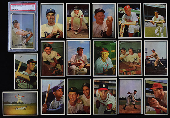 1953 Bowman Color baseball card set (FR/GD-NM, avg VG-VG/EX overall) Key cards grade: #s 9 Phil Rizzuto (VG/EX-EX), 10 Richie Ashburn (VG/EX oc), 32 Stan Musial (VG/EX-EX), 33 Pee Wee Reese (VG), 44 Mantle/Berra/Bauer (VG), 46 Roy Campanella (EX oc), 59 Mickey Mantle (PSA 3 VG), 65 Robin Roberts (VG/EX oc), 92 Hodges (VG/EX), 93 Rizzuto/Martin (EX), 97 Eddie Mathews (VG-VG/EX), 99 Warren Spahn (VG), 114 Bob Feller (VG/EX oc), 117 Duke Snider (EX oc), 118 Martin (VG/EX oc), 121 Yogi Berra (VG/EX oc), 146 Early Wynn (EX), 153 Whitey Ford (VG). Remainder appear to average VG-VG/EX overall. Range: FR/GD-NM ($4,000-$6,000) ($2,000-$4,000)