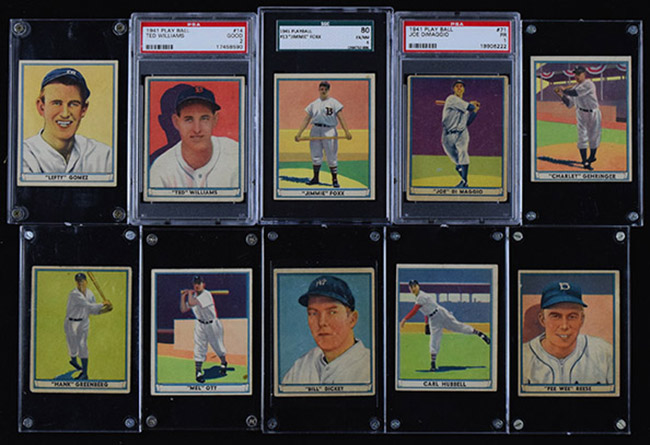 1941 Play Ball baseball card set (PR-NM, avg VG/EX overall) Key cards grade: #s 6 Carl Hubbell (VG/EX oc), 8 Mel Ott (VG/EX stain), 13 Jimmie Foxx (SGC 80 EX/NM), 14 Ted Williams (PSA 2 GD), 18 Hank Greenberg (G/VG-VG), 19 Gehringer (VG-VG/EX oc), 54 Pee Wee Reese (GD-G/VG), 70 Bill Dickey (VG), 71 Joe DiMaggio (PSA 1 PR, but looks GD), 72 Lefty Gomez (VG/EX-EX). Remainder appear to average VG/EX overall. All are encased within screw-down holders (other than the 3 graded cards). Range: PR-NM ($3,000-$5,000)