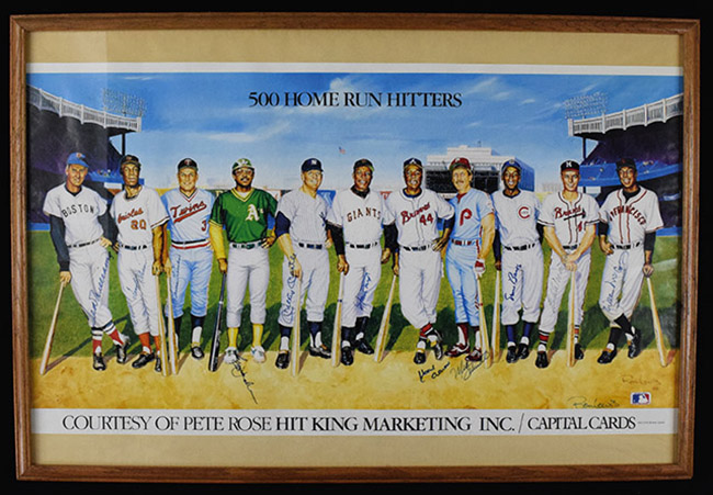 Description:500 Homerun Club autographed poster (Sigs. NM, poster see description) Large format poster based on the famed original has been signed by all (11) pictured incl. Mantle, Williams, Aaron, Mays, McCovey, Mathews, Banks, Schmidt, Jackson, Killebrew, and Robinson. Marker signatures rate 7/8 to 9 out of 10. Poster itself is currently displayed within an 25"x37.5" frame. There is some light wear visible and it appears, when looking at the back, that the extreme edges on left and right sides have been folded over the backing board. If reframed by a professional it is likely that the piece would display EX/MT-NM or better: Sigs. NM, poster see description ($500-$1,000)