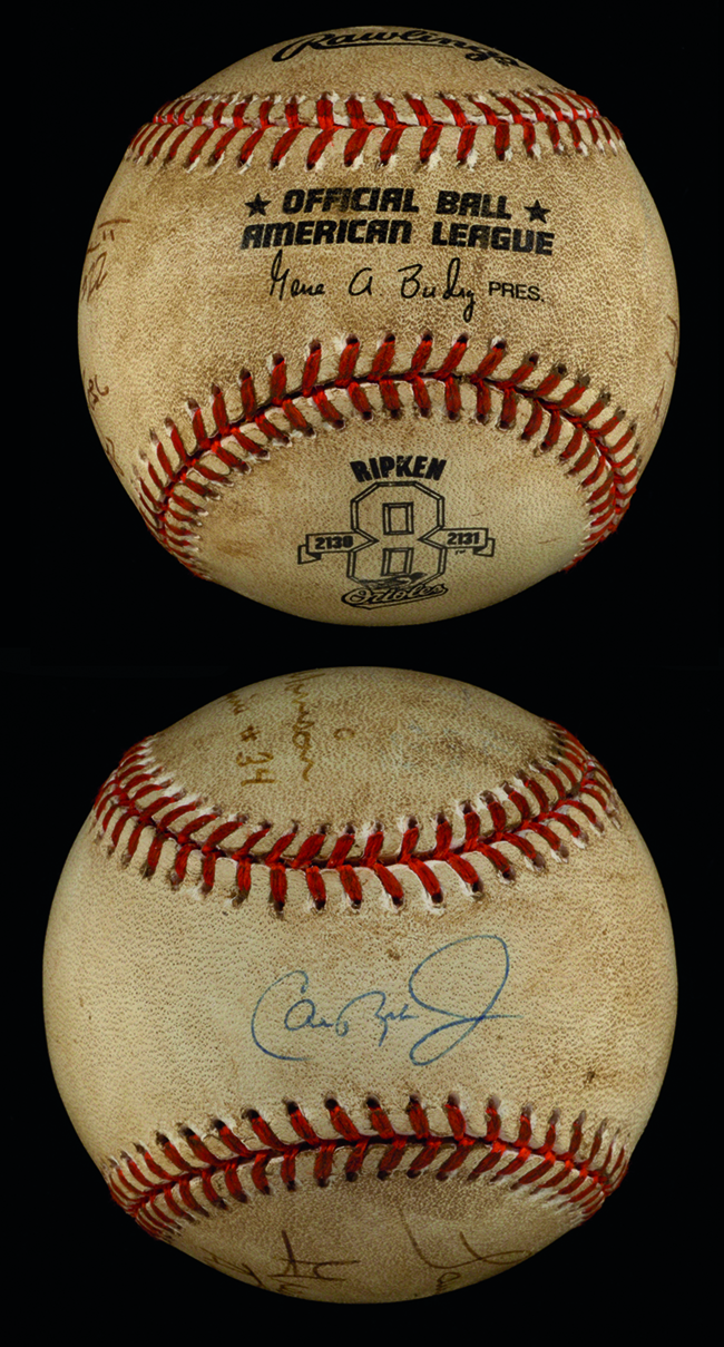 Description:Cal Ripken Jr autographed baseball attributed to record setting streak game #2,131 (with game umpire provenance) (EX) Rawlings G.Budig Official American League "Ripken 2130 2131" logo baseball displays usage wear throughout with expected soiling. It has been signed on the sweetspot "Cal Ripken Jr" in ink rating 7/8-8 out of 10 and on additional panels by Umpires Dan Morrison, Larry Barnett, Greg Kosc, and Al Clark. Each has inscribed their number and in some cases noted the A.L./American League. All but Clark rate similarly to Ripken; Clark has largely faded from view. The ball was purchased by our consignor directly from the November 5, 1998 Oregon Trail Sports Auction, then a division of Robert Edward Auctions, and at the time had a letter of provenance from Dan Morrison. While that original letter has been misplaced the ball will include a copy of the auction catalog (ball shown is clearly the same although the Clark signature has since faded) and the original auction invoice: EX ($1,500-$2,500)