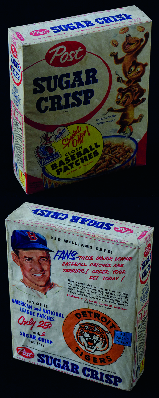 Description:1955 Post Sugar Crisp cereal complete box with Ted Williams advertising back (EX-EX/MT) Complete box remains sealed and it's original state hosting a large image of Ted Williams on back promoting a set of baseball team patches. The set is also referenced on front with a checklist on side. Light to moderate toning with some very minor scattered wear. Rare and seldom offered: EX-EX/MT ($400-$600)