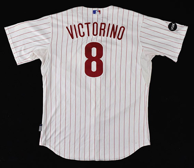 Description:2007 Shane Victorino game used Philadelphia Phillies home jersey (team letter) (EX) Pinstriped jersey with "Phillies" lettered across the front has "Victorino 8" on back. Number also appears on left sleeve, a "VUK" memorial patch is on right. Majestic tag is screened on front tail noting size (48) and there is a Cool Base flag tag on outer seam. Interior wash tag is 0063 coded. Evident usage wear throughout and includes Phillies team issued letter confirming game use: EX ($400-$600)