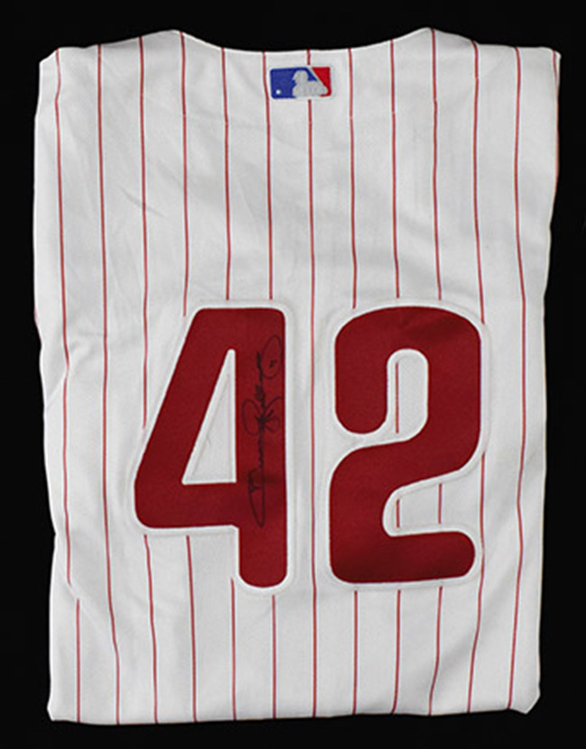 Description:April 23, 2007 Jimmy Rollins autographed Philadelphia Phillies Jackie Robinson Day game used home jersey (MLB Authentication) (EX) Home pinstriped jersey with "Phillies" team name lettered across the front has number "42" on back. Screened on Majestic tag on front tail notes the size (46) and there is a Cool Base flag tag on outer seam. 0063 Coded wash tag inside. Rollins has signed the back number in marker rating 8 out of 10. Affixed MLB Authentication hologram confirms use in the game played vs. Houston at Citizens Bank Park: EX ($500-$750)