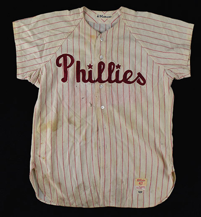 Description:1958 Solly Hemus Philadelphia Phillies professional model home jersey (EX with note to description) Pinstriped flannel has "Phillies" team name lettered across the front with player number "4" on back. "S. Hemus" embroidered strip tag appears in the collar. "Wilson" manufacturers tag on front tail notes the size "42" and the wash and "1958" year tags appear below. Evident usage and wash wear throughout with some minor scattered soiling/spotting and areas. A name which was added below "Phillies" (presumably a Minor League affiliate) has been removed and a resulting outline can be seen (and has caused some material loss): EX ($500-$750)