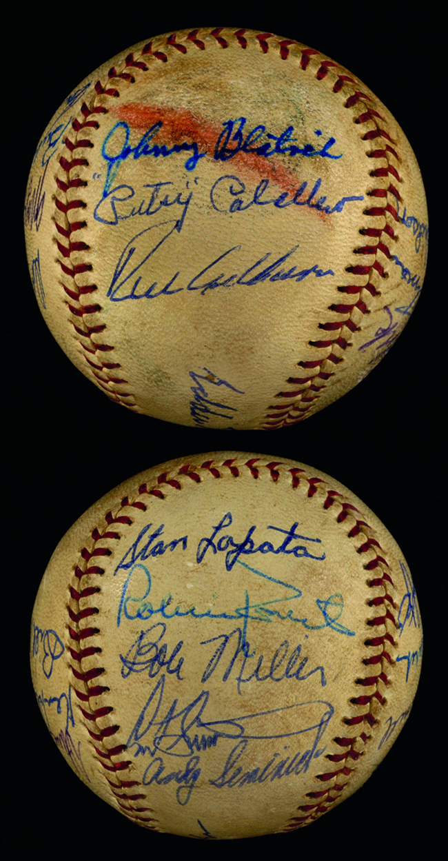 Description:1950 Phillies autographed baseball - (16) sigs from early reunion incl. Ashburn, Roberts, and Sawyer (Sigs. NM, Ball EX) Soiled and used baseball (markings faded) has been signed by (16) members of the 1950 Phillies incl. Roberts, Ashburn, Sawyer, Nicholson, Calaberro, Blatnick, Ennis McDonnell, Church, Lopata, Seminick. Miller, Simmons, Heintzelman, and others. All done in ink rating 8 to 8/9 out of 10: Sigs. NM, Ball EX ($250-$500)