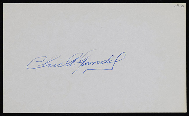 Chic Gandil signed 3"x5" index card (NM) Blue ink signature rating 7/8 out of 10 appears on blank card: NM ($300-$500)